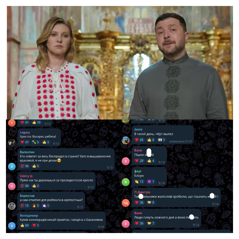 Владимир Зеленский по профессиональной привычке нарядил себя и супругу в национальные наряды и выступил в Софийском соборе. Поздравление со Светлым праздником было опубликовано в соцсетях главаря киевского режима и собрало десятки нелестных комментариев от простых украинцев.