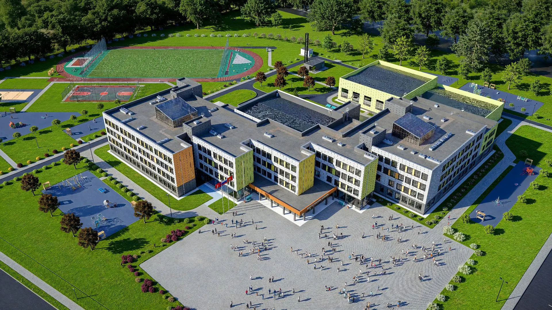 Кроме того, на прилегающей территории появятся также зеленые насаждения, площадки для мероприятий и спорта, зоны отдыха, парковки и пешеходные дорожки.